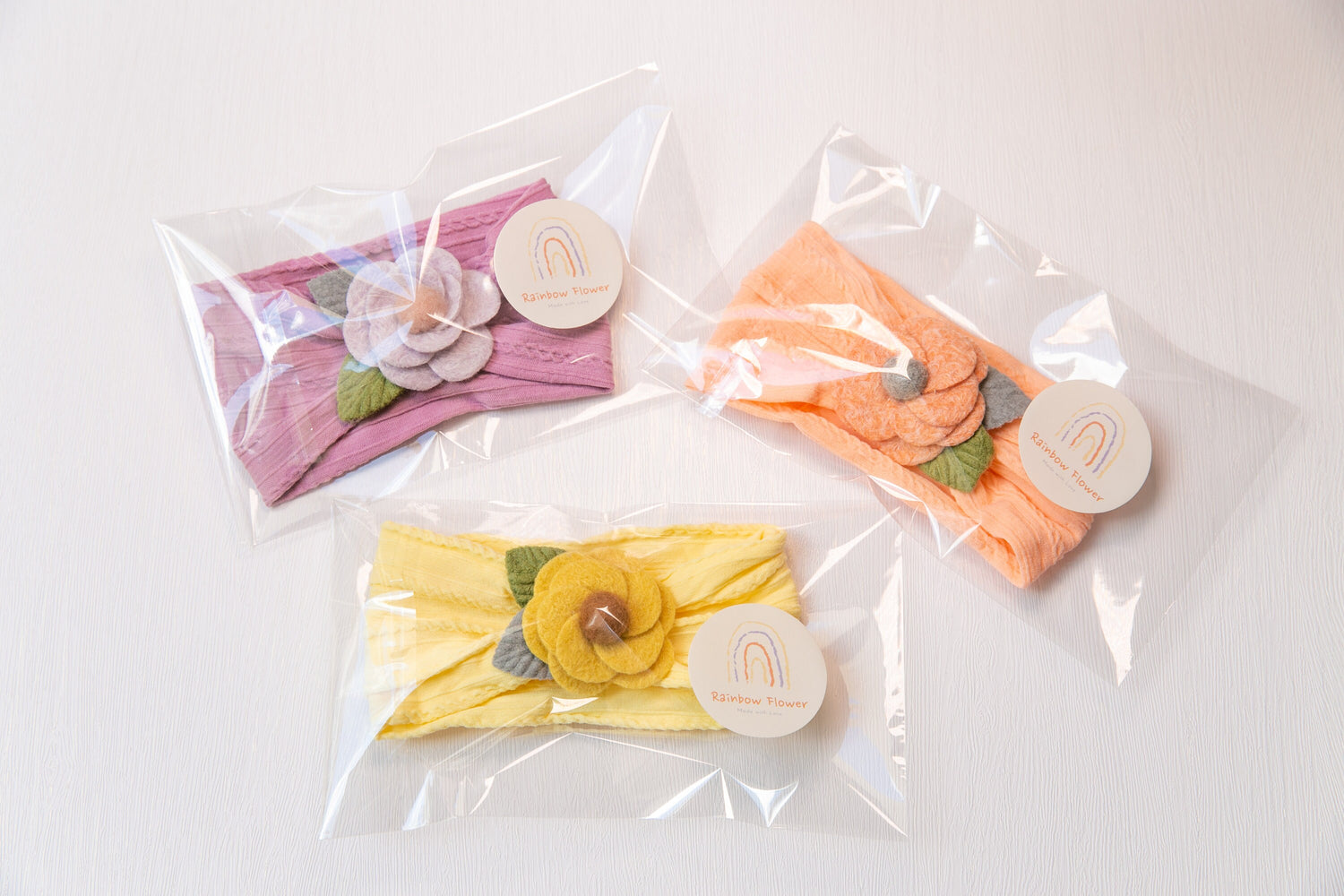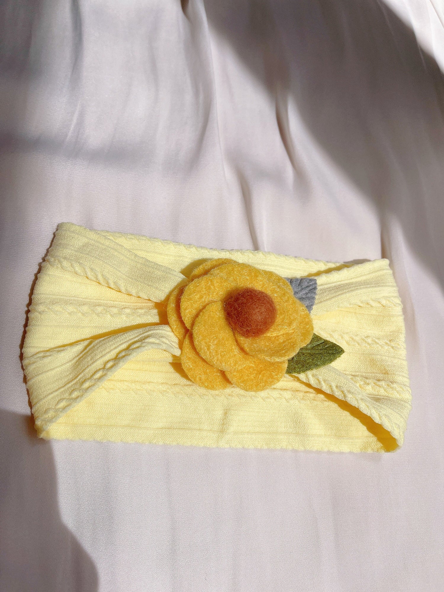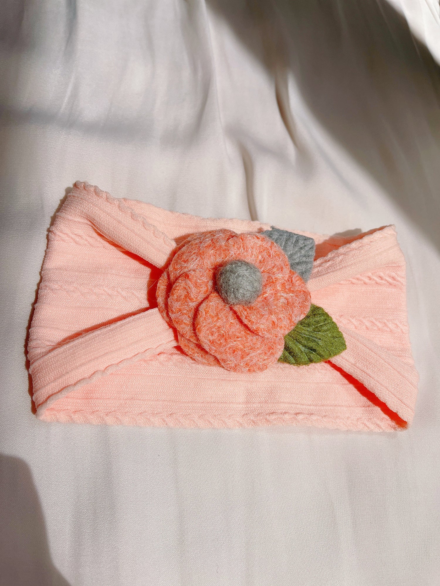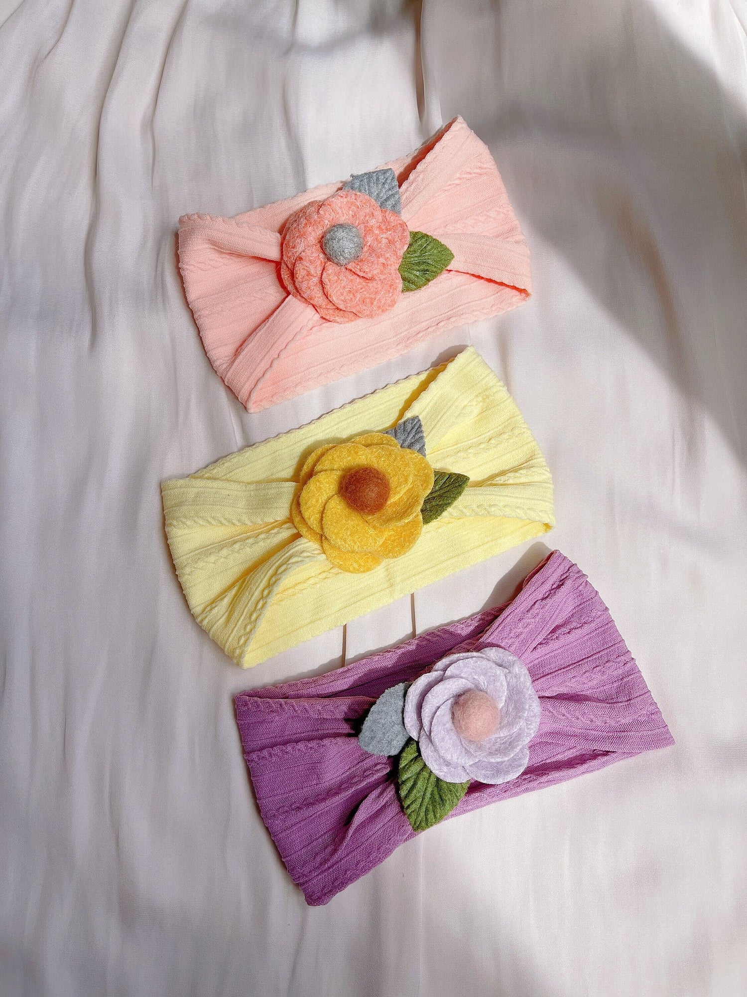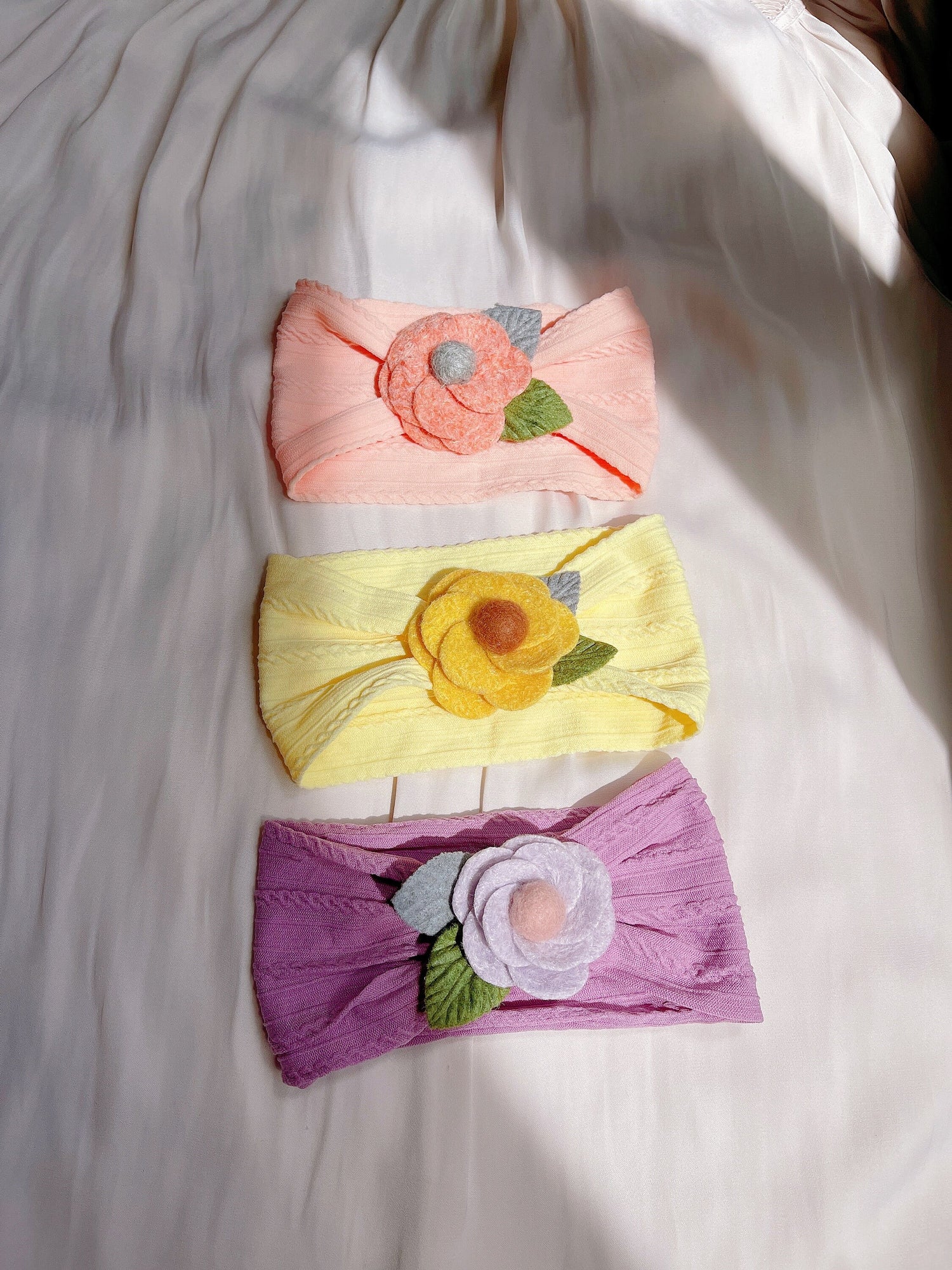 flower headband. Attached to a one size fits all nylon headband. Our nylon headbands are great for all ages and truly stretches for newborns to toddler girls. (3 months- 2.5 years old)