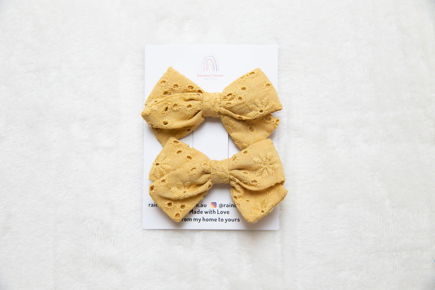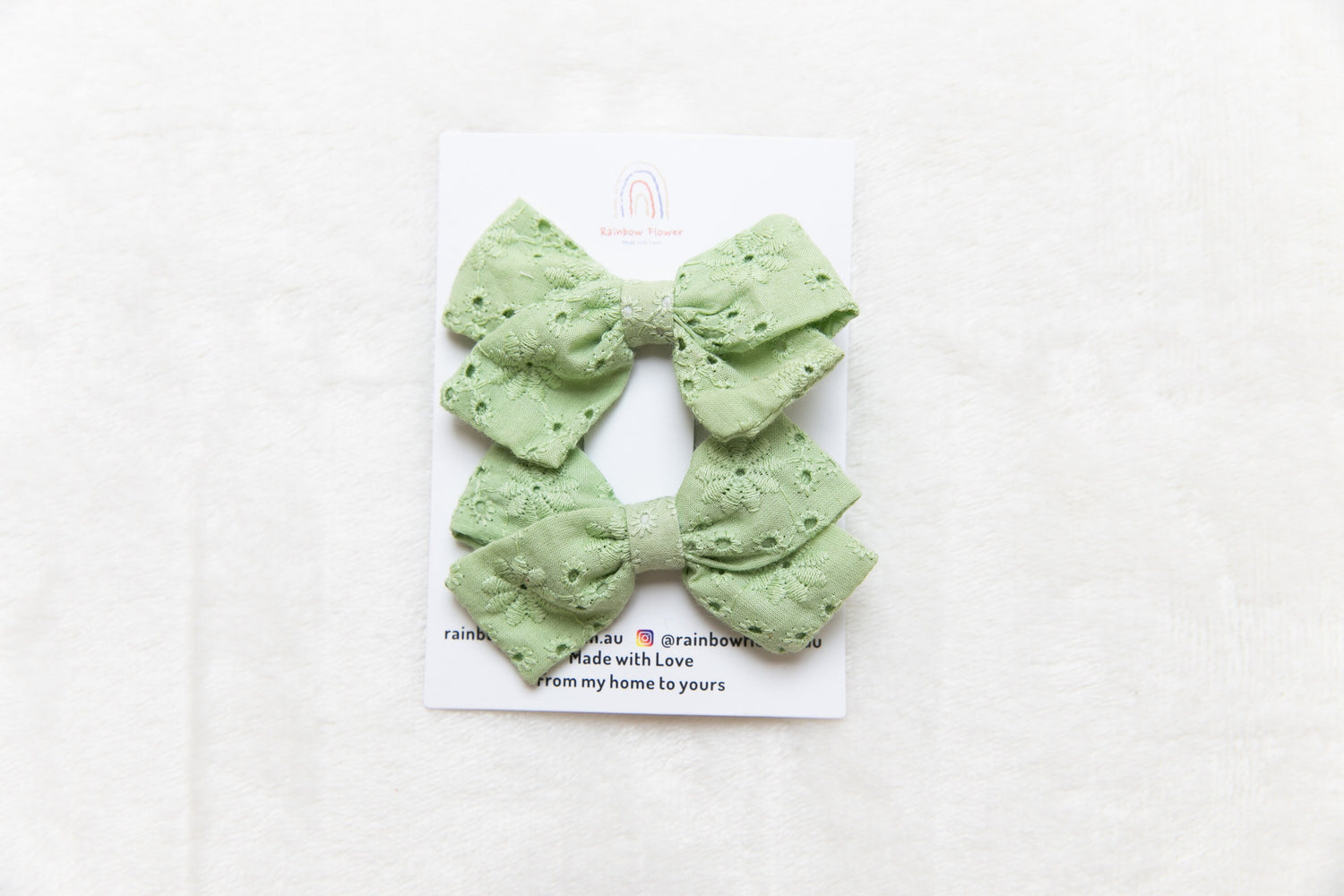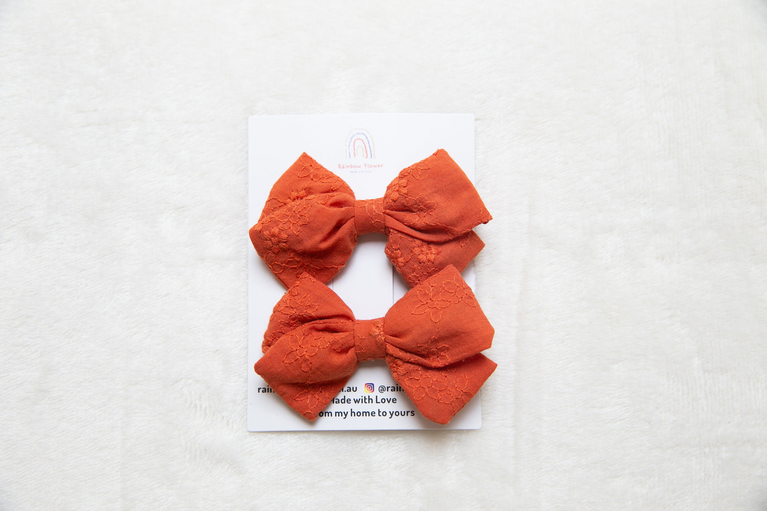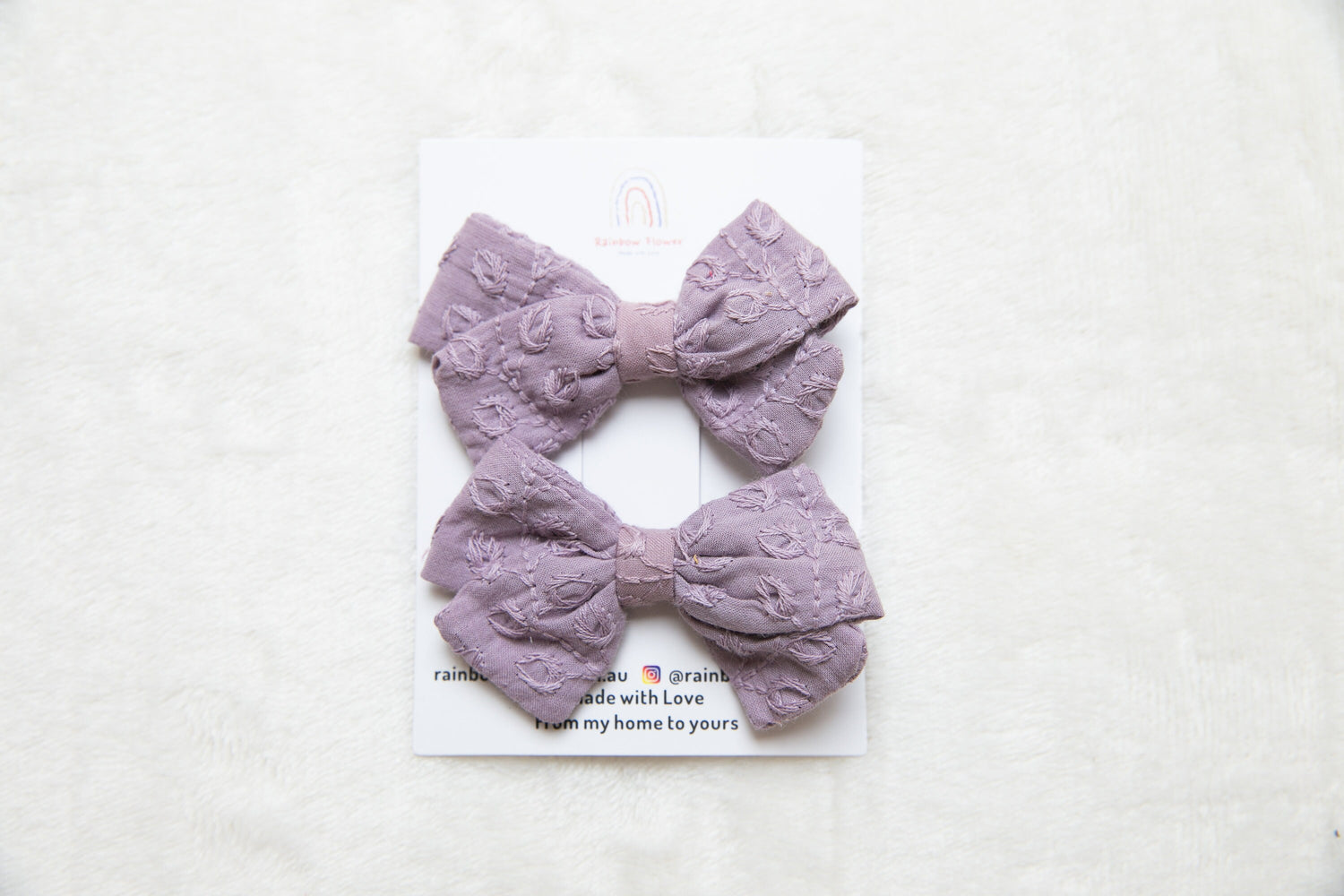 set of 2 high-quality hair clips made from exquisite embroidered pure cotton fabric. These adorable flower embroidery bow clips are designed for baby girls, toddlers, kids, and students. The set includes bows in charming shades of Red, Blush, Yellow, Lavender, Green, and Peach, all meticulously hand-tied.