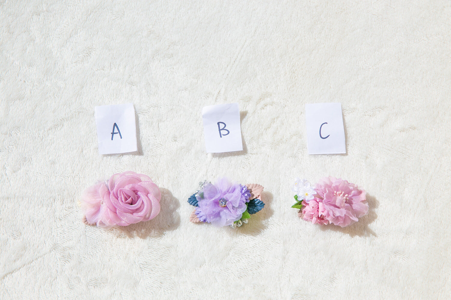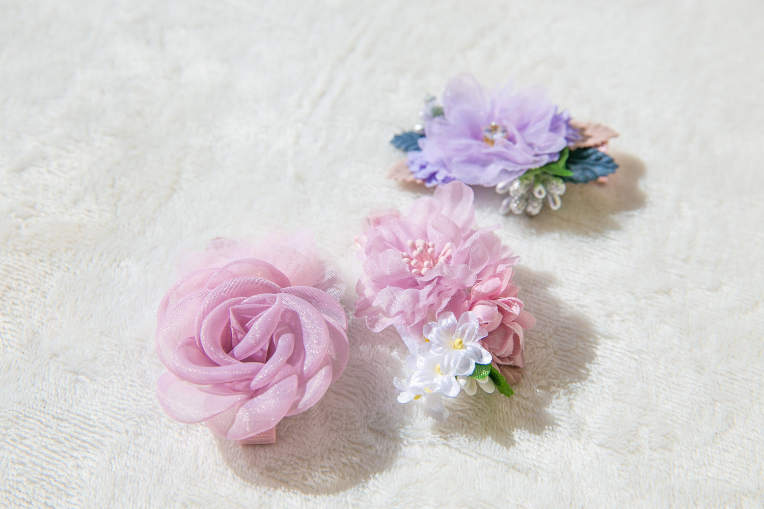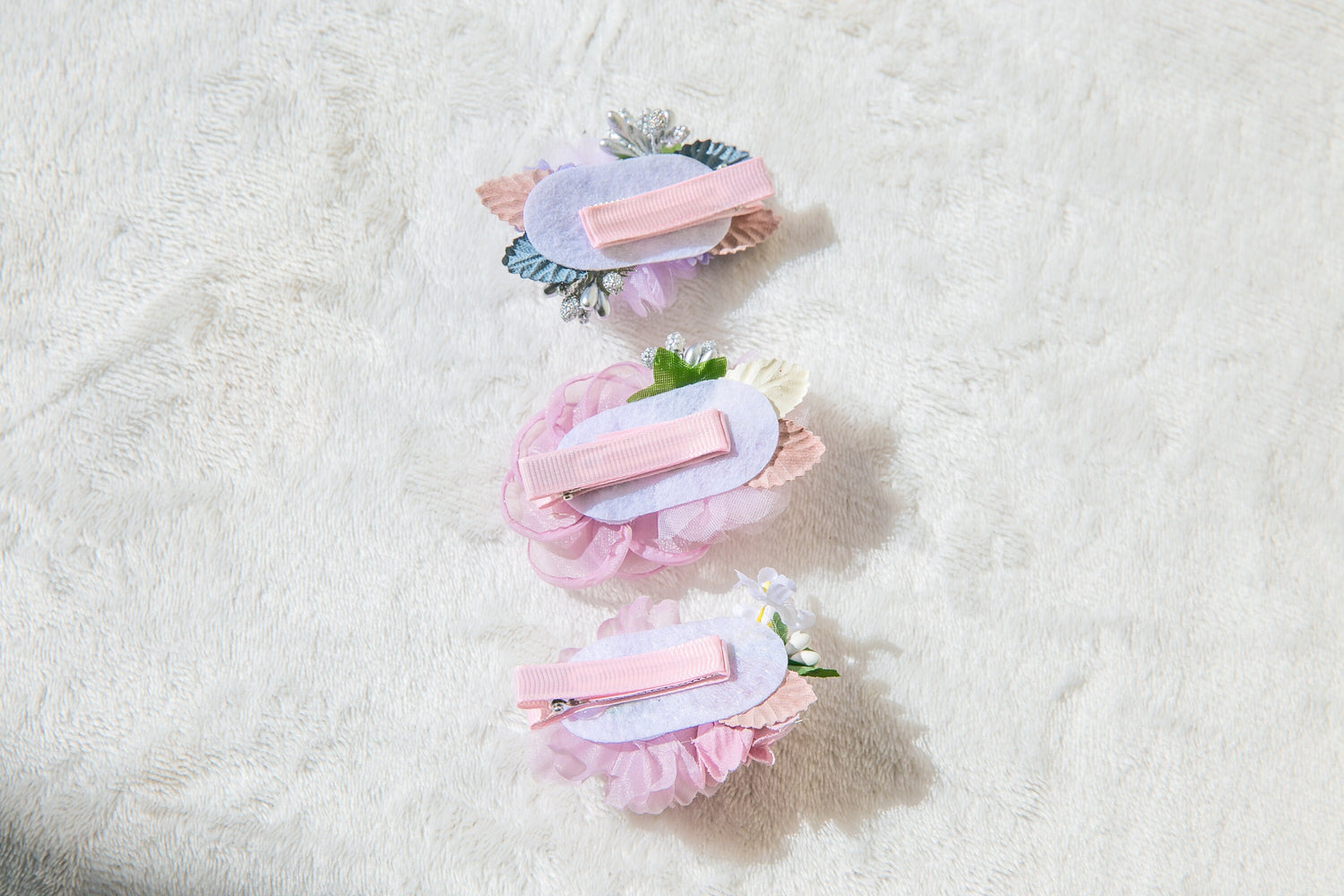 With three different styles to choose from, our unique designs are truly one-of-a-kind. You won't find these enchanting hair clips anywhere else. Each clip is meticulously crafted using beautiful fabric adorned with sparkling rhinestones and faux pearls, adding a touch of glamour and sophistication.
