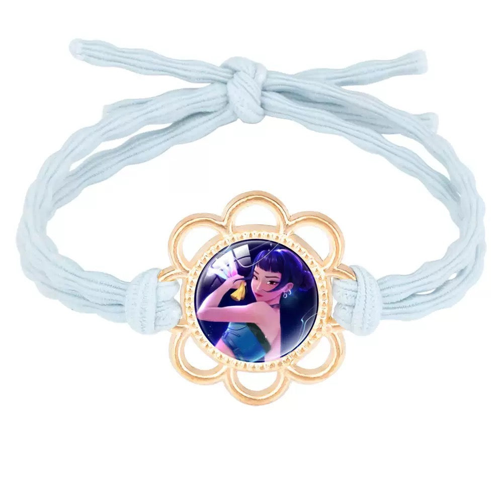 Handmade K-Pop Demon Hunter HUNTRIX Hair Tie featuring Rumi, Mira, and Zoey Saja Boys - Gold Flower Setting