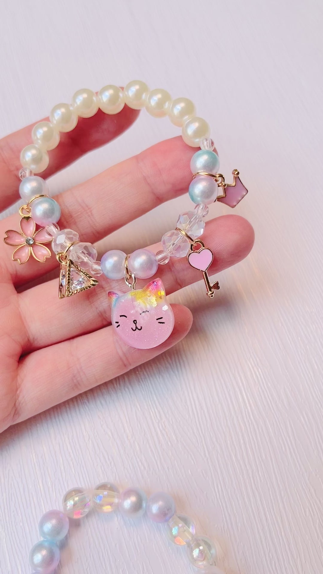 High Quality girl bracelet, baby toddler kids Cat Bunny Donut Flower pearl rhinestone key bracelet