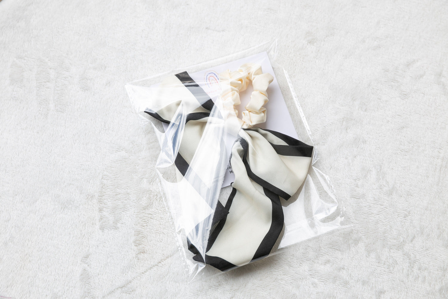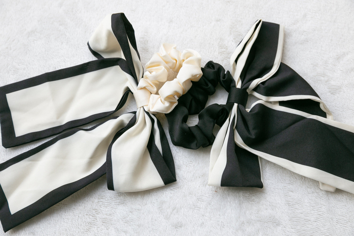 High-Quality Satin Scrunchie with Oversize Bow, a must-have hair accessory that exudes effortless chic and timeless elegance. This scrunchie features a classic black and white color combination, adding a touch of sophistication to any hairstyle.