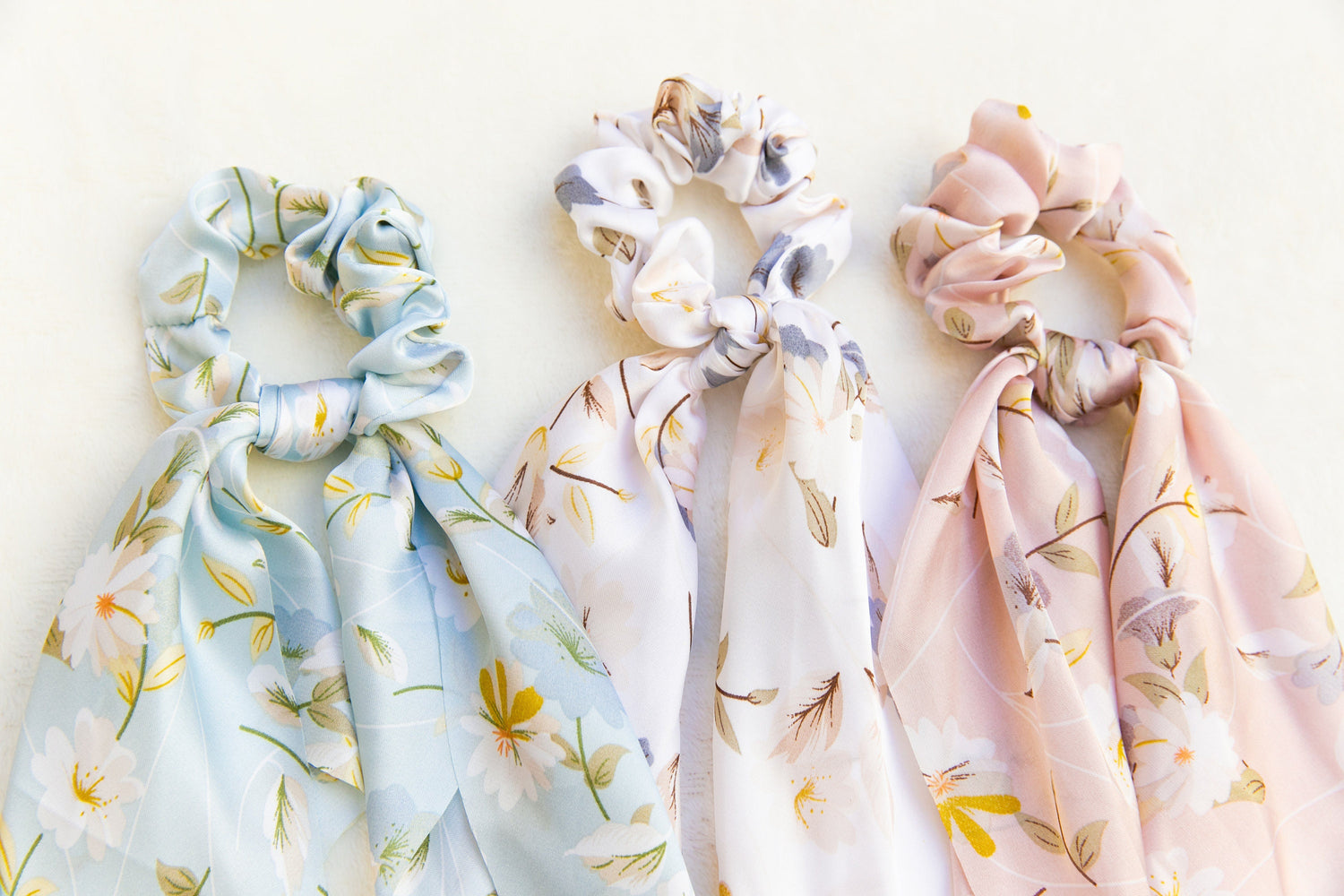 Lightweight, smooth, silky hair ties, scrunchies with long ties with elegant color tone.