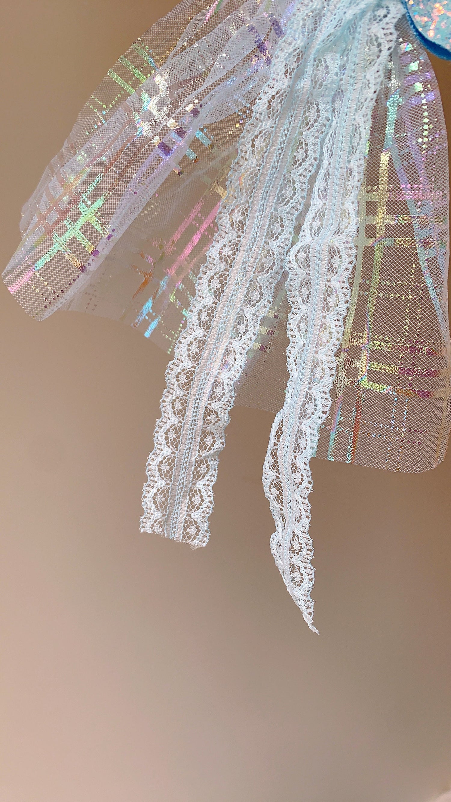 The bow is oversized, with the wings of the bow unfurling beneath, measuring approximately 16cm X 20cm. Adorned with numerous sparkles, the left side features Elsa's portrait, while the center boasts an exquisite blue crystal, adding a touch of elegance. The fabric beneath the bow is made of a specially glossy material, and the lace ribbon is both delicate and soft. In person, it looks even more stunning than in the photos!