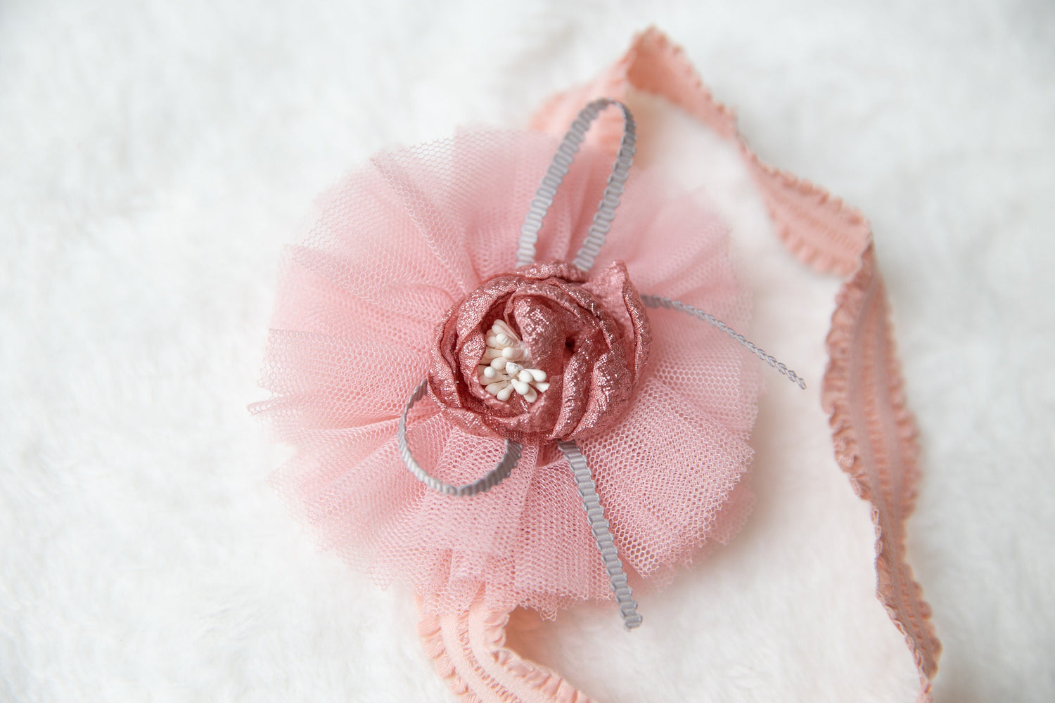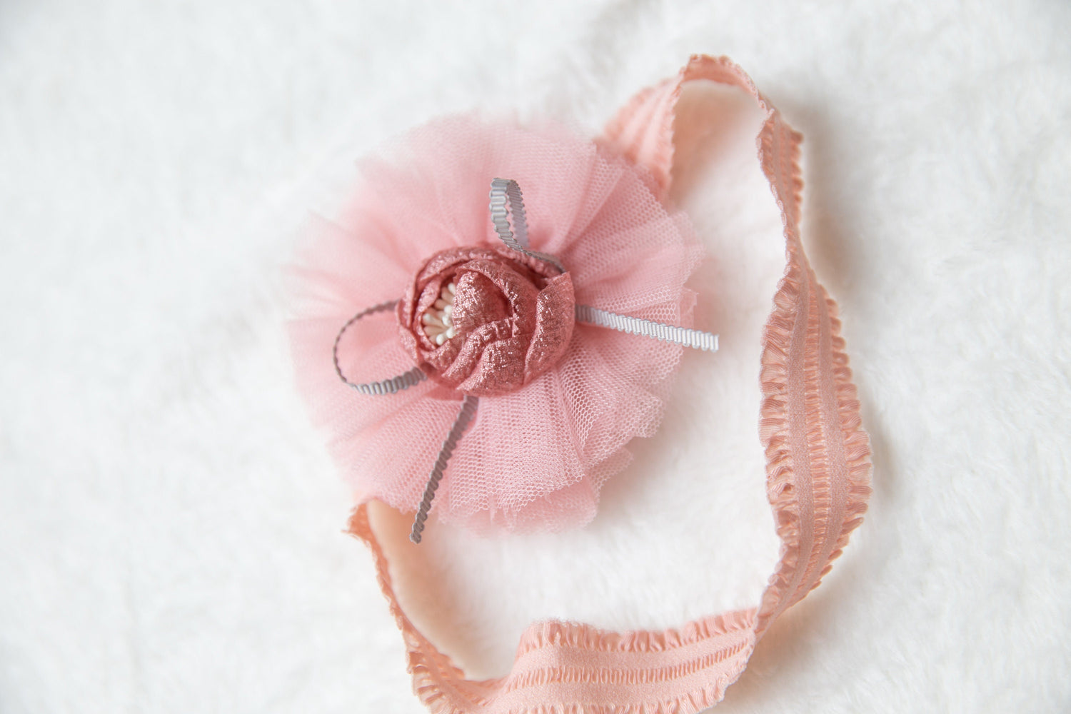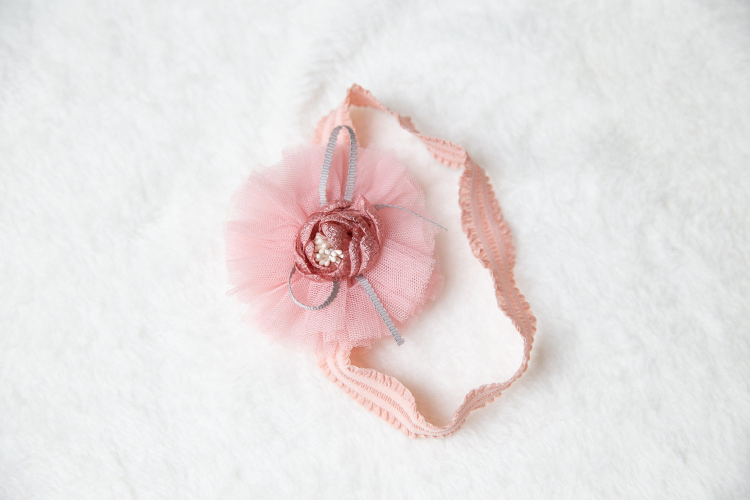 flower headband. Attached to a one size fits all nylon headband. Our nylon headbands are great for 3 months - 2 years old